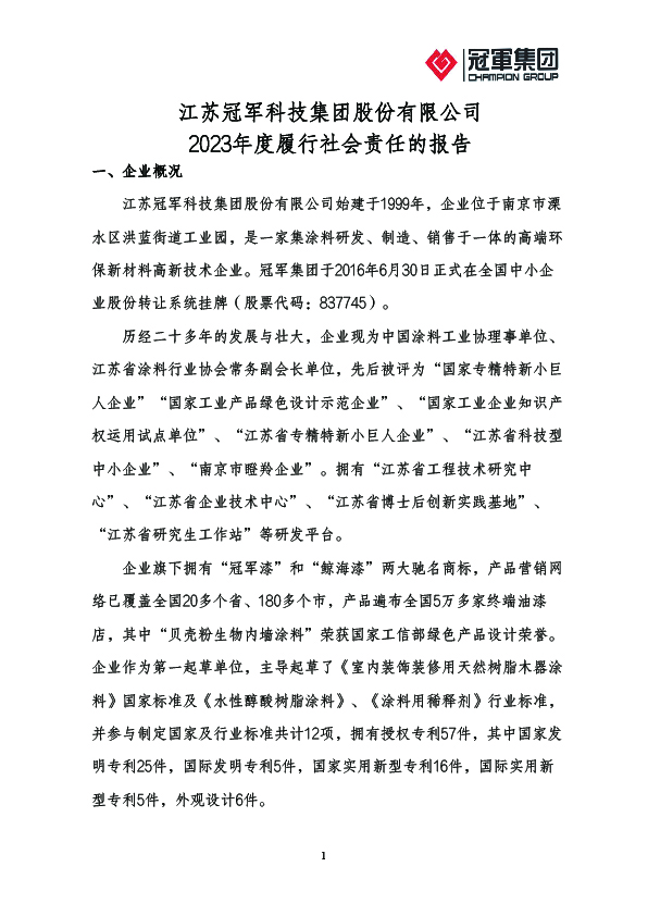 江蘇冠軍科技集團股份有限公司 2023年度履行社會責任的報告